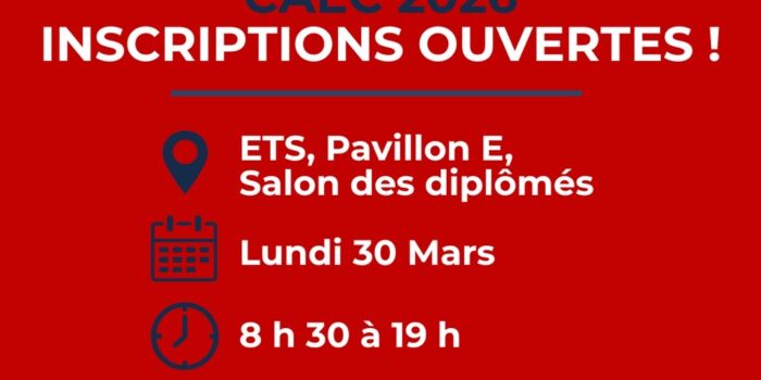Le Congrès Annuel des Étudiants Chercheurs de l’ÉTS (CAÉC) 2026 se tiendra le 30 mars 2026, en salle E-2033, de 8 h 30 à 18 h 00. L’événement est ouvert à l’ensemble de la communauté de recherche de l’ÉTS.