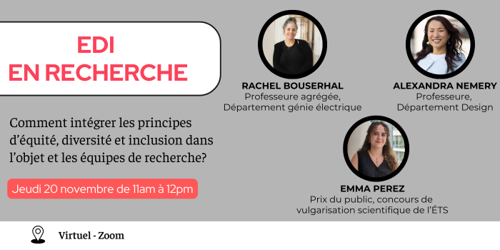 Les questions d’équité, de diversité et d’inclusion occupent une place importante dans le milieu de la recherche. Avec les profils sociodémographiques qui se diversifient de plus en plus, et la volonté de tenir compte des facteurs d’inégalités, les organismes subventionnaires exigent que l’EDI soit considéré dans l’objet, la conduite et la constitution des équipes de recherche.