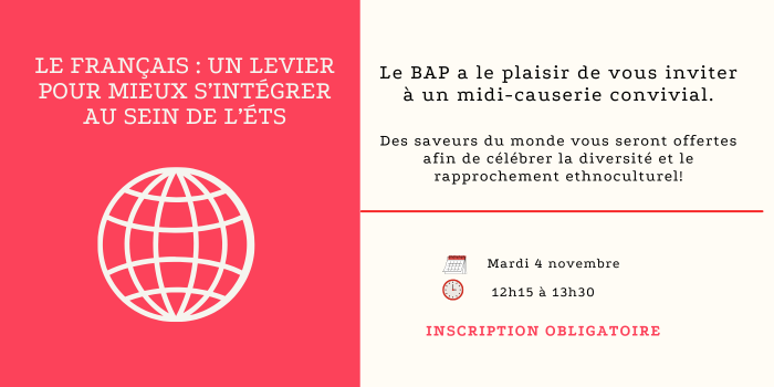 Parce que l’ÉTS valorise la richesse apportée par la diversité ethnoculturelle et que le français est l’outil fédérateur de notre communauté, ce moment convivial est organisé afin d’échanger des bonnes pratiques, les défis rencontrés et les ressources disponibles, autour d’un buffet composé de saveurs du monde!