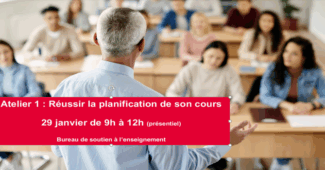 Nouveaux articles Atelier pédagogique : Réussir la planification de son cours 9 janvier 2026 Le Bureau de soutien à l’enseignement (BSE) est heureux de vous convier à l’atelier 1. Cet atelier fait partie...