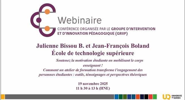 Ce webinaire présentera les effets d’un atelier de formation offert à des membres du corps enseignant sur la motivation et l’engagement des étudiantes et étudiants à l’École de technologie supérieure (ÉTS). La démarche s’appuie sur une analyse réflexive des différences de perception entre les départements de génie à l’ÉTS concernant la motivation de la communauté étudiante. Ceci illustrant des enjeux institutionnels importants pour maximiser la réussite étudiante. Le cadre théorique de Viau (2009) sert de référence : la dynamique motivationnelle est analysée à travers ses déterminantes et ses sources. Selon une démarche de recherche-action, l’atelier de formation, associé à l’implication du corps enseignant, sert de levier pour analyser les effets sur la motivation et l’engagement non seulement des étudiantes et étudiants, mais aussi du personnel enseignant et de la communauté universitaire. Le témoignage d’un professeur viendra enrichir la présentation par un partage de pratiques et de ressources pour stimuler la motivation, soutenir l’engagement et encourager la réflexion sur l’évolution et l’effet des pratiques pédagogiques.
